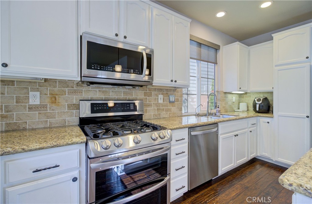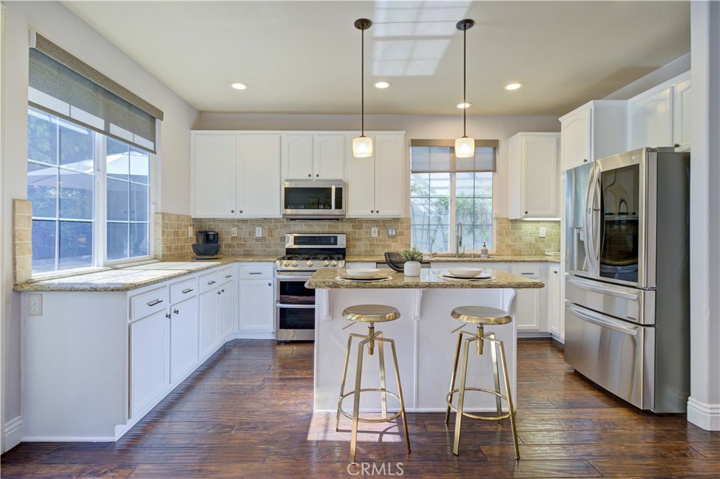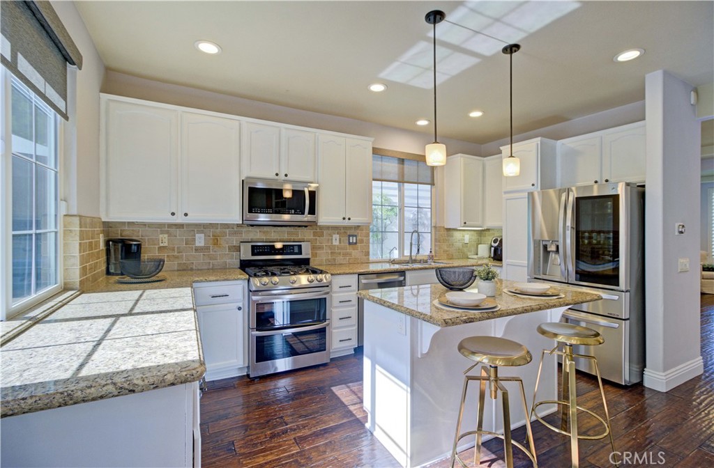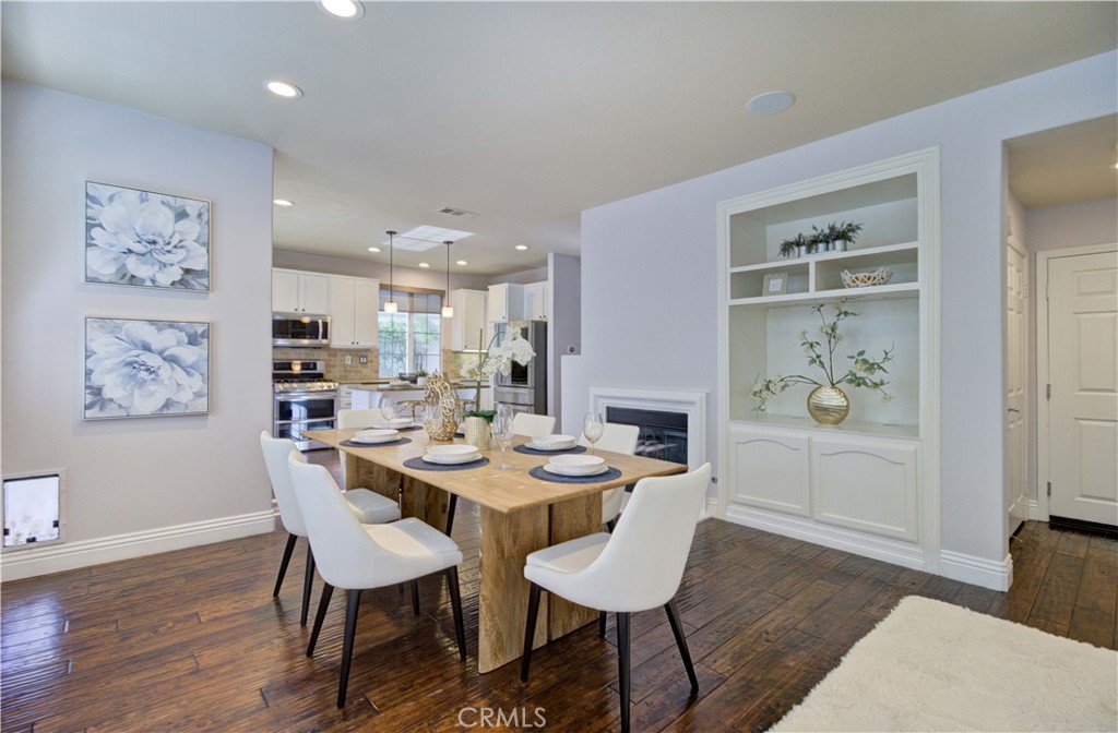 At the heart of the home, the kitchen becomes a natural place to gather. A generous island anchors the space, framed by granite countertops, crisp white cabinetry, designer backsplash, and newer appliances. The oversized dining area feels made for long conversations, holiday dinners, and moments that turn into memories. The family room features a built-in entertainment center, surround sound, and a fireplace that adds warmth and ambiance on cool evenings.