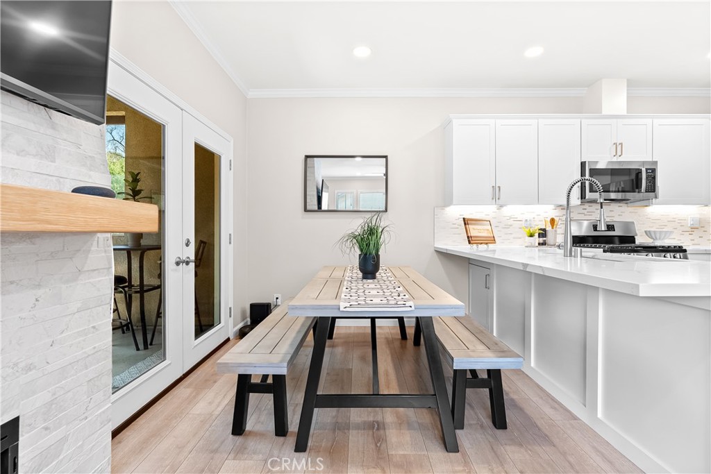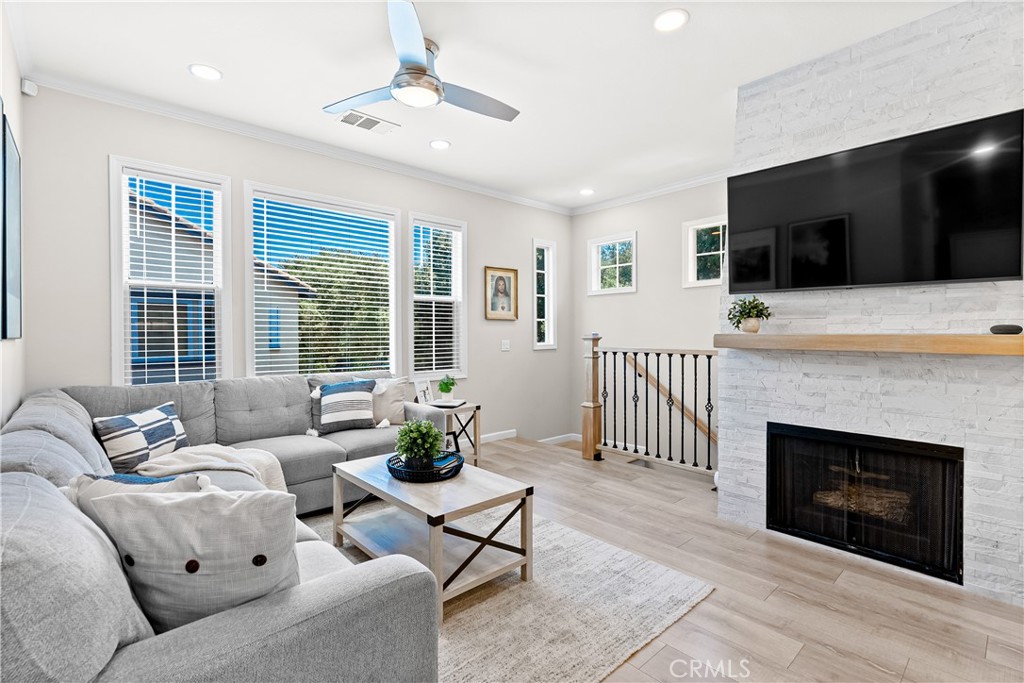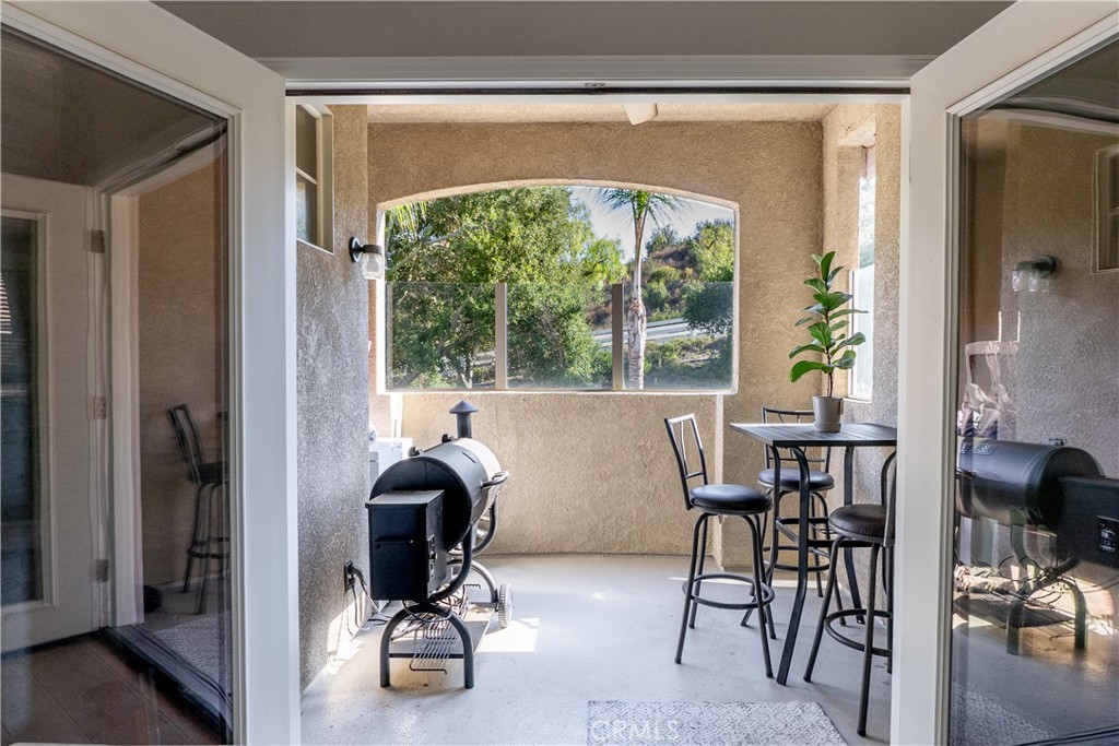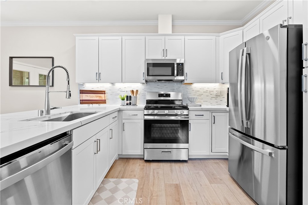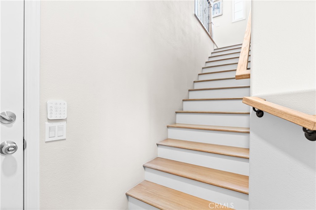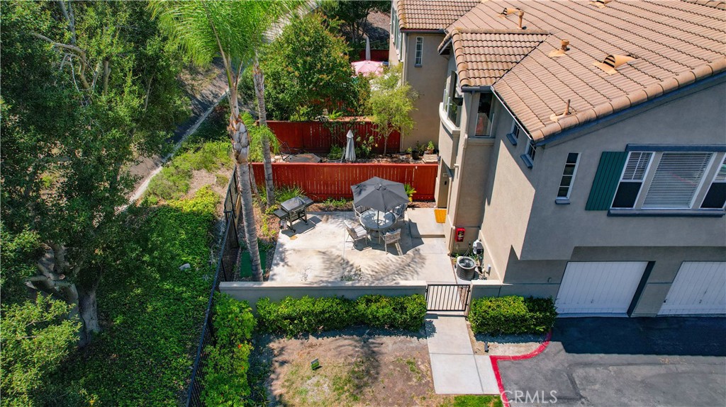Beautifully remodeled End Unit with one of the Largest Outdoor Patios in the community of Wagon Wheel. Wagon Wheel is perched into the stunning hillside of Trabuco Canyon. This loft style home is situated over the attached one car garage showcasing epoxy floor with direct access. Very recently remodeled with high quality finishes that include: High End LVP flooring with warm wood tone, Fully encased fireplace in designer stone with wood mantle, crown molding, baseboards, custom window casings and recessed lighting. This home has also been Repiped with Pex, offering the buyer another layer of comfort and reliability. Your stunning remodeled kitchen that opens seamlessly to your living areas features, quality white shaker cabinetry, breakfast bar seating, GE stainless steel appliances, quartz countertops, under cabinet lighting, hydro IV filter for drinking water, a brand new refrigerator and farmhouse style stainless steel sink. Exit to your private balcony, coated with polyurethane decking, through French Doors off your dining area. Your primary bedroom offers a walk-in closet and new ceiling fan. The secondary bedroom is graciously sized. The bathroom has been remodeled to include a newer vanity, lighting, toilet and extra tall shower. Your additional designated parking space is #36. Wagon Wheel has a deluxe community pool and spa, walking distance from the home.