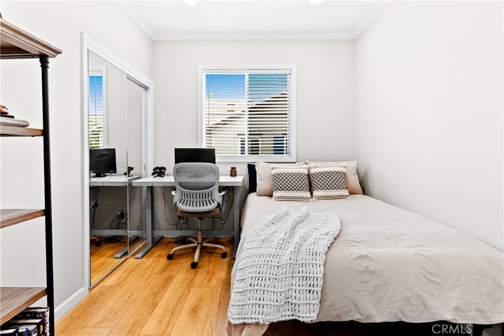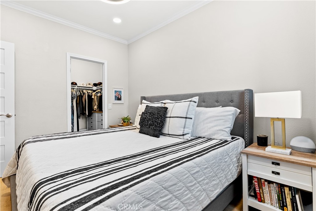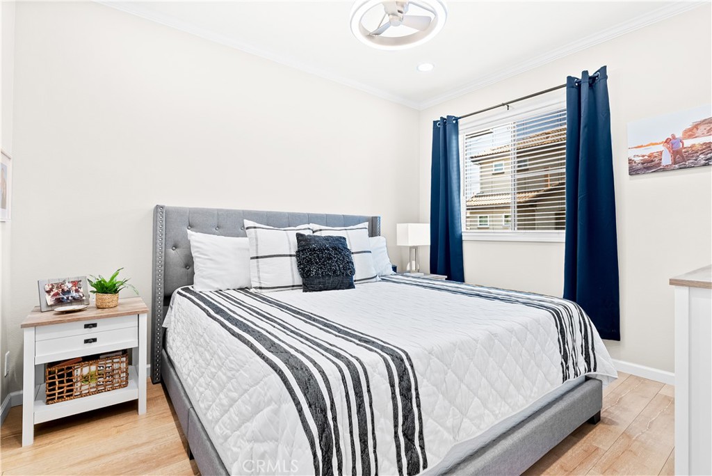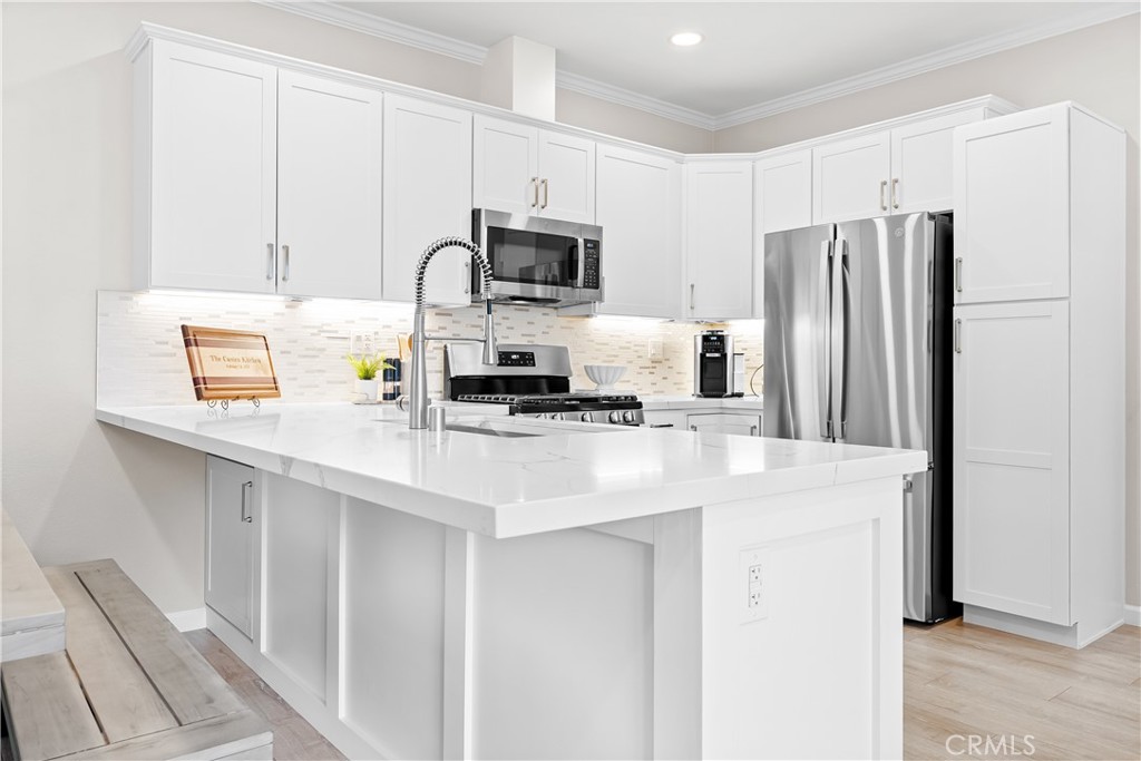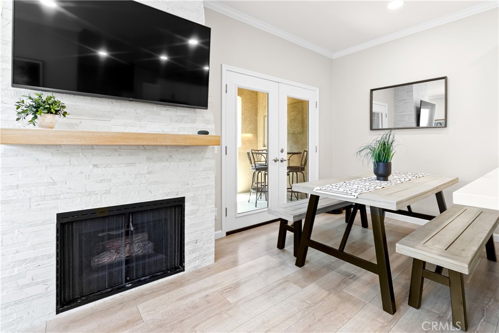Beautifully remodeled End Unit with one of the Largest Outdoor Patios in the community of Wagon Wheel. Wagon Wheel is perched into the stunning hillside of Trabuco Canyon. This loft style home is situated over the attached one car garage showcasing epoxy floor with direct access. Very recently remodeled with high quality finishes that include: High End LVP flooring with warm wood tone, Fully encased fireplace in designer stone with wood mantle, crown molding, baseboards, custom window casings and recessed lighting. This home has also been Repiped with Pex, offering the buyer another layer of comfort and reliability. Your stunning remodeled kitchen that opens seamlessly to your living areas features, quality white shaker cabinetry, breakfast bar seating, GE stainless steel appliances, quartz countertops, under cabinet lighting, hydro IV filter for drinking water, a brand new refrigerator and farmhouse style stainless steel sink. Exit to your private balcony, coated with polyurethane decking, through French Doors off your dining area. Your primary bedroom offers a walk-in closet and new ceiling fan. The secondary bedroom is graciously sized. The bathroom has been remodeled to include a newer vanity, lighting, toilet and extra tall shower. Your additional designated parking space is #36. Wagon Wheel has a deluxe community pool and spa, walking distance from the home.