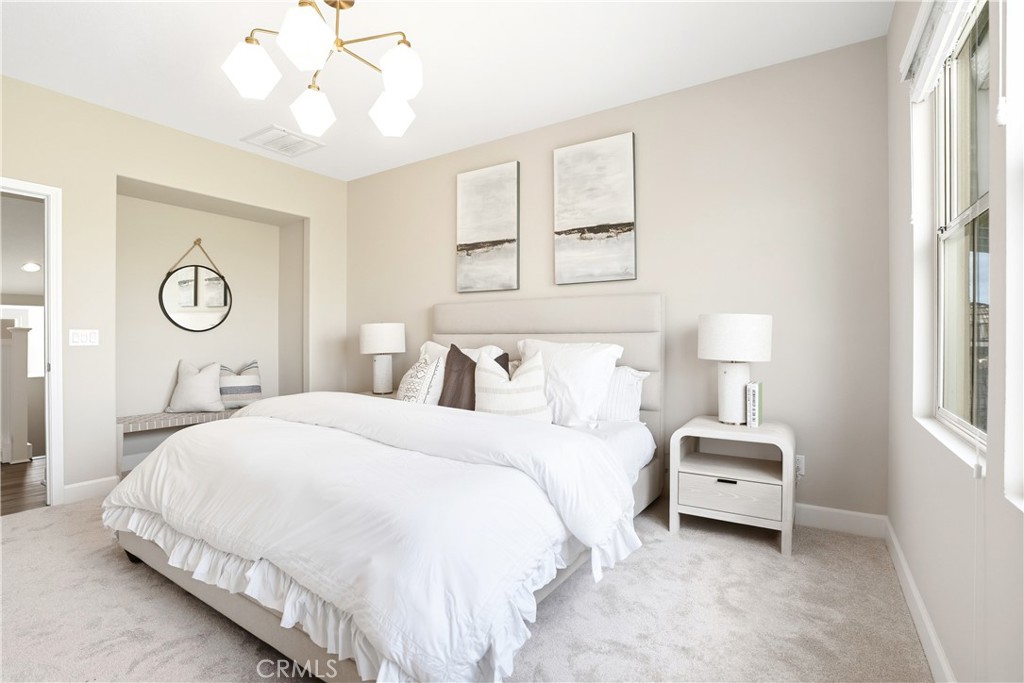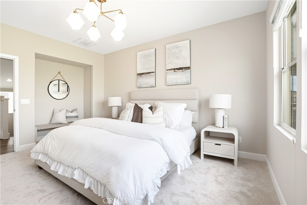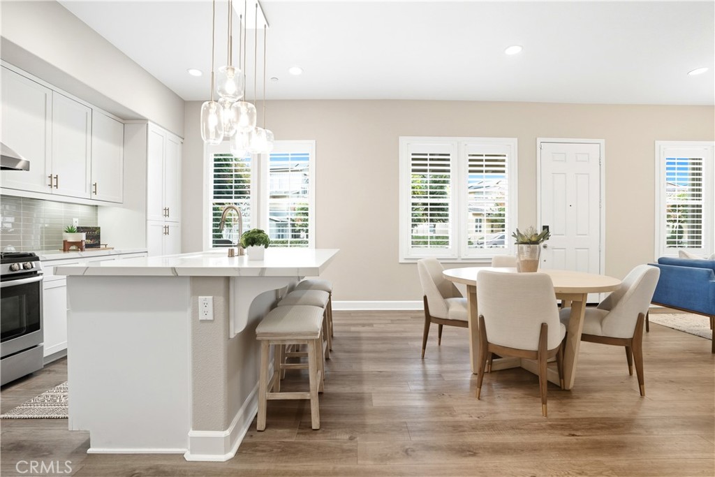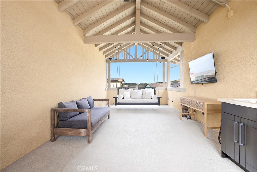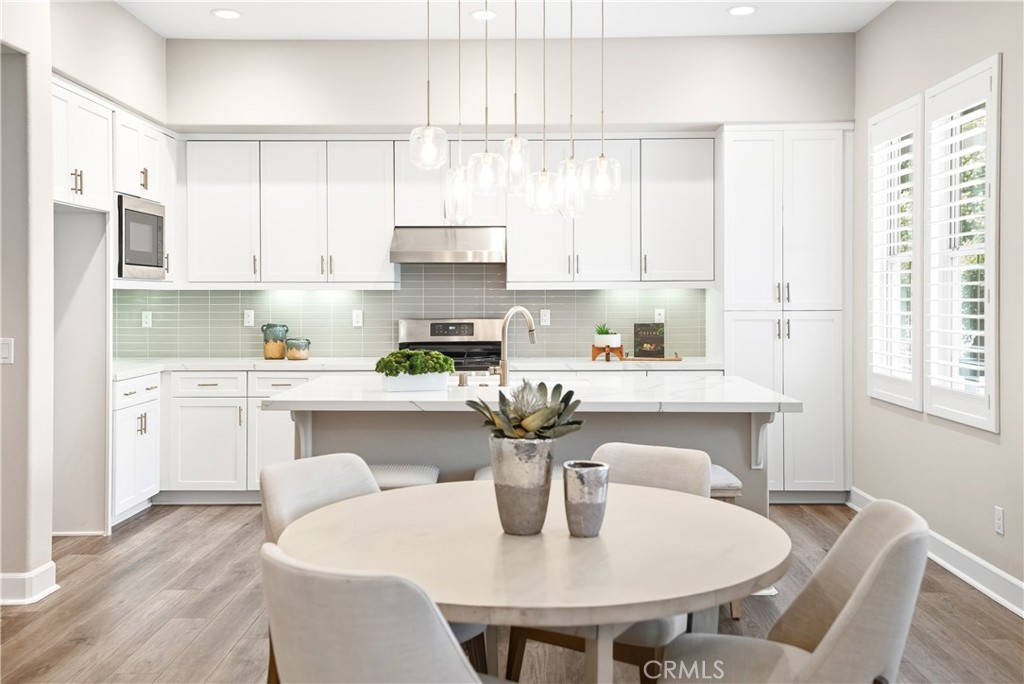 This beautifully upgraded home blends modern design with luxury finishes throughout. From the moment you arrive, you'll be captivated by the spacious front yard, and oversized covered patio--complete with built-in seating and a cozy firepit, perfect for entertaining or enjoying a quiet evening outdoors. Step inside to discover an open-concept layout featuring elegant vinyl plank flooring, fresh interior paint, plush new carpet, recessed lighting, and upgraded baseboards. The bright and airy living room flows effortlessly into a dining area and a chef-inspired kitchen equipped with stainless steel Energy Star appliances, a gas range with hood and griddle, a self-cleaning convection oven, modern tile backsplash, gorgeous quartz countertops, and a large center island with farmhouse sink and breakfast bar. Upstairs, the luxurious primary suite offers a true retreat with a spacious walk-in closet, beautifully upgraded ensuite bathroom with tiled shower and floor, quartz countertops and dual vanities. Two additional bedrooms, a full guest bathroom with dual sinks, and an upper-level laundry room with added cabinetry provide plenty of space and convenience for daily living. The third-level covered rooftop deck boasts panoramic mountain views and is ideal for BBQs, al fresco dining--with a built-in sink, refrigerator, and counter space--or simply lounging with a built-in TV setup. Additional home features include touchless keypad entry, custom window coverings including wood shutters and blinds, double pane windows, upgraded light fixtures, downstairs framed mirror, modern hardware, direct access 2-car garage with overhead storage and ball rack, and Energy Star features integrated throughout the home. You will also have access to award-winning amenities such as baseball fields, playgrounds, a sports park, the Canyon House, Blue Hummingbird Coffeehouse, The Pond, Lagoon and Lake, Camp Out facility, resort-style pools, the farms, an arcade, state-of-the-art workout gyms, dog park, a zipline, splash pads, biking trails, NEV roads, and tennis and pickleball courts (to name a few). Additionally, it is just 15 minutes from the beach and conveniently located near the 241 freeway