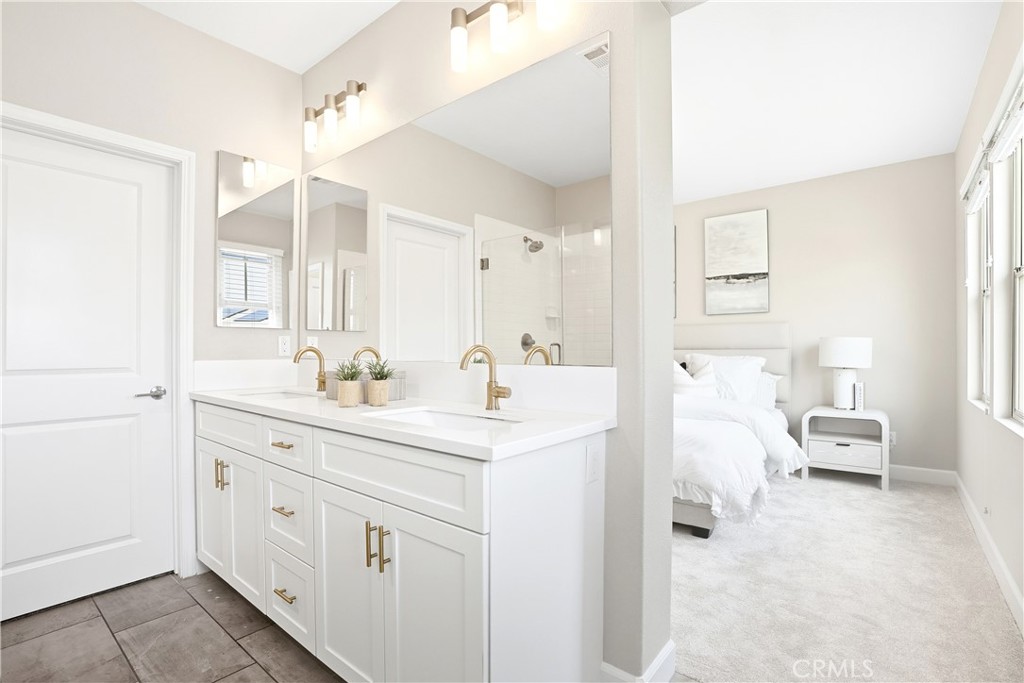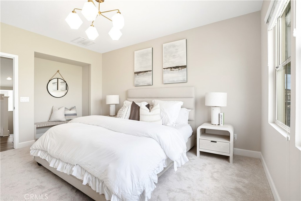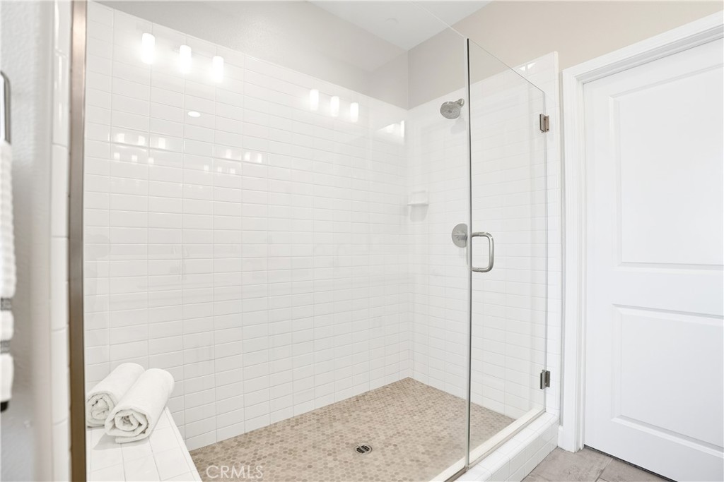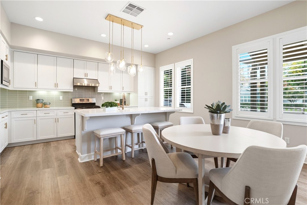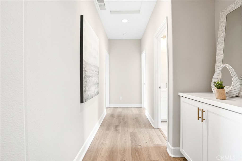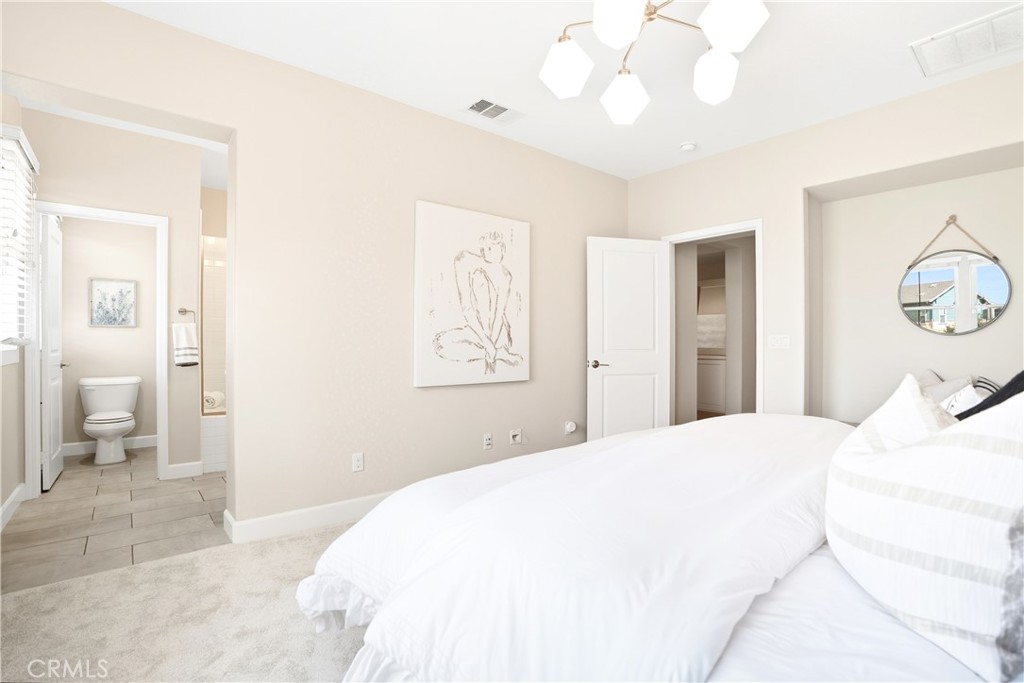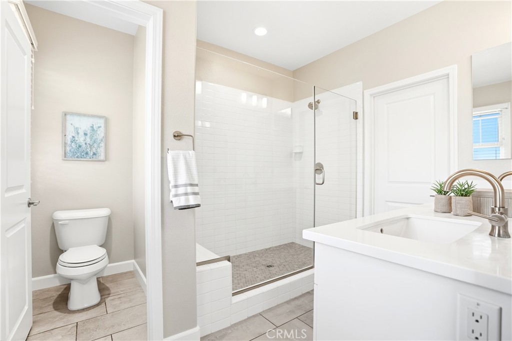 Upstairs, the luxurious primary suite offers a true retreat with a spacious walk-in closet, beautifully upgraded ensuite bathroom with tiled shower and floor, quartz countertops and dual vanities. Two additional bedrooms, a full guest bathroom with dual sinks, and an upper-level laundry room with added cabinetry provide plenty of space and convenience for daily living. The third-level covered rooftop deck boasts panoramic mountain views and is ideal for BBQs, al fresco dining--with a built-in sink, refrigerator, and counter space--or simply lounging with a built-in TV setup. Additional home features include touchless keypad entry, custom window coverings including wood shutters and blinds, double pane windows, upgraded light fixtures, downstairs framed mirror, modern hardware, direct access 2-car garage with overhead storage and ball rack, and Energy Star features integrated throughout the home. You will also have access to award-winning amenities such as baseball fields, playgrounds, a sports park, the Canyon House, Blue Hummingbird Coffeehouse, The Pond, Lagoon and Lake, Camp Out facility, resort-style pools, the farms, an arcade, state-of-the-art workout gyms, dog park, a zipline, splash pads, biking trails, NEV roads, and tennis and pickleball courts (to name a few). Additionally, it is just 15 minutes from the beach and conveniently located near the 241 freeway