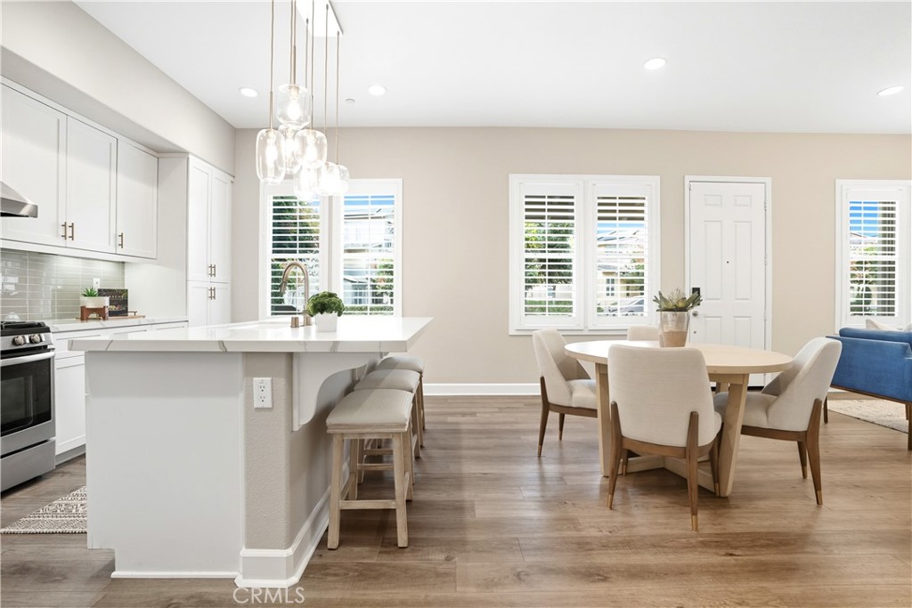 Step inside to discover an open-concept layout featuring elegant vinyl plank flooring, fresh interior paint, plush new carpet, recessed lighting, and upgraded baseboards. The bright and airy living room flows effortlessly into a dining area and a chef-inspired kitchen equipped with stainless steel Energy Star appliances, a gas range with hood and griddle, a self-cleaning convection oven, modern tile backsplash, gorgeous quartz countertops, and a large center island with farmhouse sink and breakfast bar.